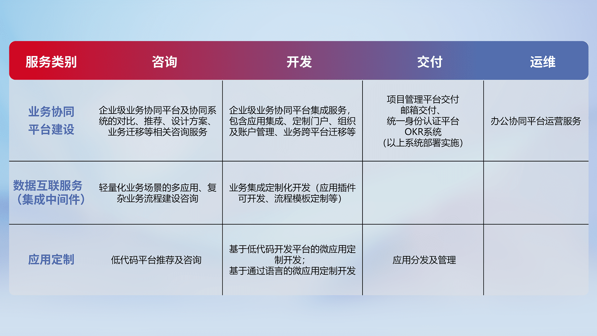 针对钉钉、、企微、、IDaas等平台级产品提供产品的规划、、方案、、交付、、、定制化开发等服务,,,,实现如统一协同办公、、智能客户服务、、混合会议管理、、智能数据查询、、、等业务场景,,,实现数字化转型。。。。