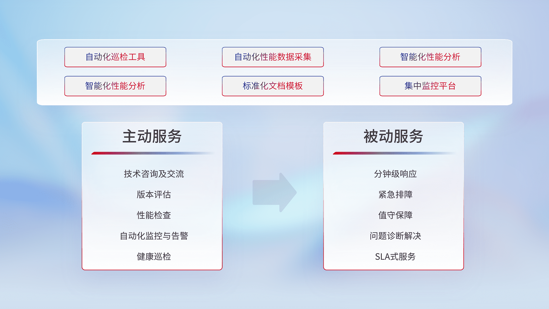 智能化工具和标准化文档,,保障服务质量,,提供主动服务(包含技术咨询、、、、版本评估、、性能检查、、、、自动化监控与告警、、健康巡检)和被动服务包含(分钟级响应、、、紧急排障、、、值守保障、、、问题诊断解决、、SLA服务)。。。